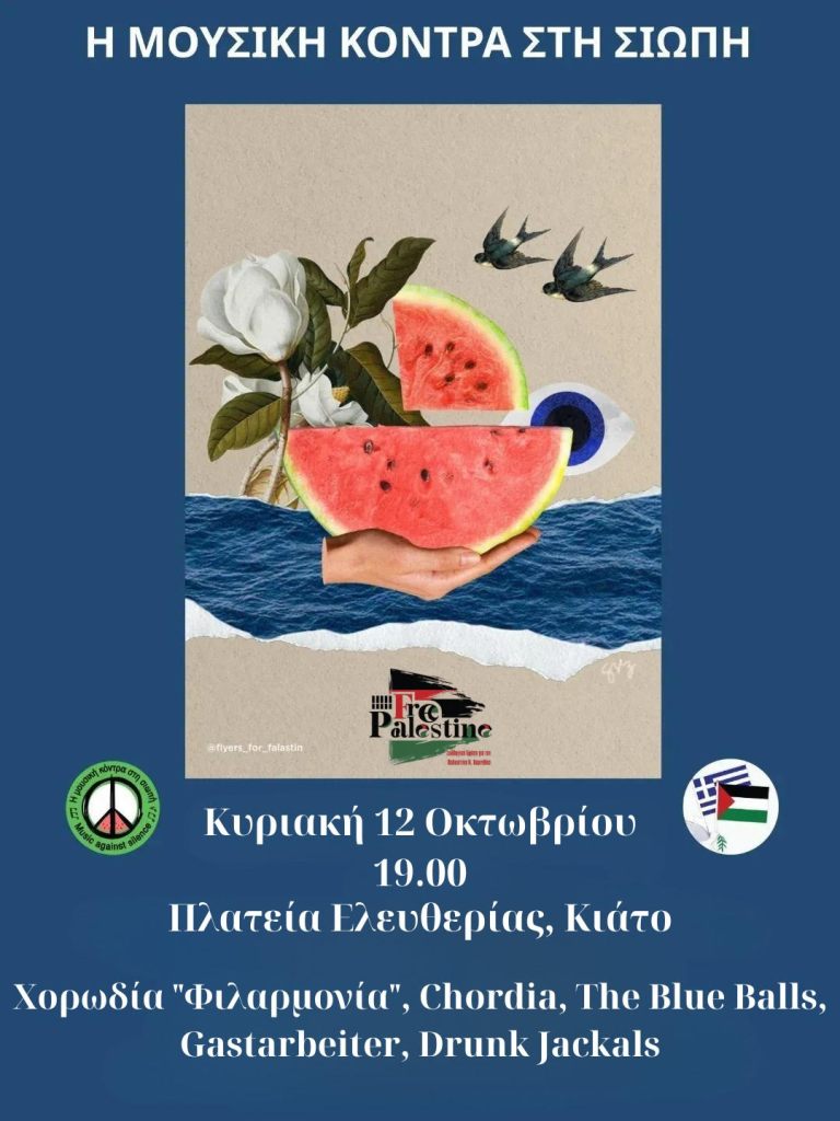 Η «Συλλογική Δράση για την Παλαιστίνη Ν. Κορινθίας» σε σύμπραξη με την κοινότητα «Η μουσική κόντρα στη σιωπή» και την Παλαιστινιακή Παροικία Ελλάδος σας προσκαλεί σε συναυλία αλληλεγγύης στον ηρωικό παλαιστινιακό λαό, την Κυριακή 12 Οκτωβρίου, στο Κιάτο, στην πλατεία Ελευθερίας (Δημαρχείο), στις 7:00μμ.