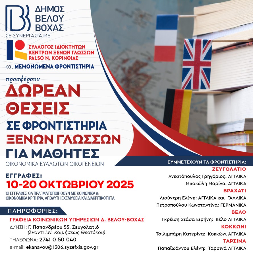 Μια σημαντική κοινωνική δράση με στόχο τη στήριξη των οικογενειών που δυσκολεύονται οικονομικά, ανακοινώνει ο Δήμος Βέλου – Βόχας. Σε συνεργασία με τον Σύλλογο Ιδιοκτητών Κέντρων Ξένων Γλωσσών PALSO Ν. Κορινθίας και μεμονωμένα φροντιστήρια, προσφέρει δωρεάν θέσεις σε φροντιστήρια ξένων γλωσσών για μαθητές οικονομικά ευάλωτων οικογενειών.