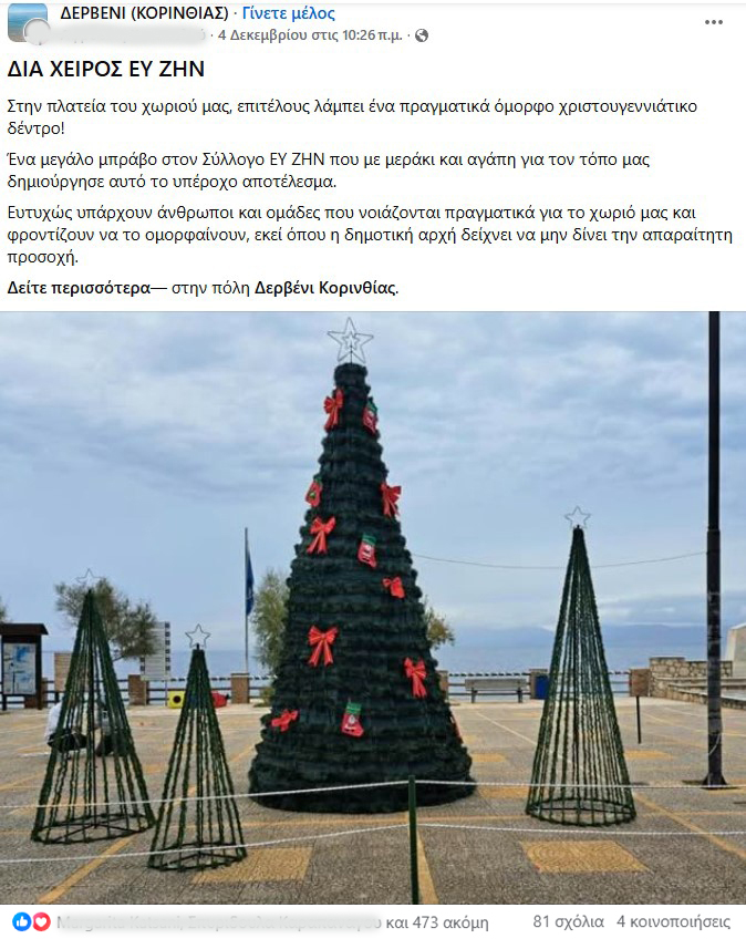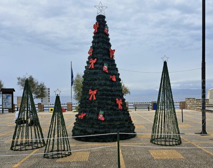 Μέσα σε αυτό το γκρίζο τοπίο, η πλατεία του χωριού φόρεσε τα γιορτινά της. Όχι όμως χάρη στον κεντρικό σχεδιασμό του Δήμου. Ο στολισμός είναι αποτέλεσμα της προσφοράς και της αγάπης των ανθρώπων του Συλλόγου «ΕΥ ΖΗΝ».
