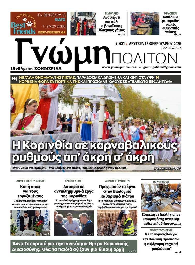 ΚΥΚΛΟΦΟΡΕΙ Γνώμη Πολιτών, φ. 321, Δευτέρα 16 Φεβρουαρίου 2026 By gnomipoliton on 19/02/2026 • ( Σχολιάστε ) Κοινοποιήστε: Μοιραστείτε στο X(Ανοίγει σε νέο παράθυρο) Χ Mοιραστείτε στο Facebook(Ανοίγει σε νέο παράθυρο) Facebook Μου αρέσει! Φόρτωση... Σχετικά Κατηγορίες:ΚΥΚΛΟΦΟΡΕΙ Tagged as: ΔΗΜΟΣ ΒΕΛΟΥ-ΒΟΧΑΣ, ΔΗΜΟΣ ΚΟΡΙΝΘΙΩΝ, ΔΗΜΟΣ ΣΙΚΥΩΝΙΩΝ, ΠΕΡΙΦΕΡΕΙΑ ΠΕΛΟΠΟΝΝΗΣΟΥ