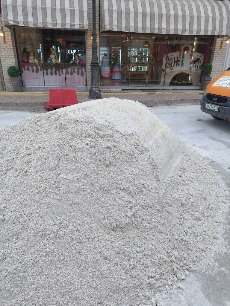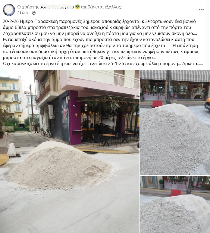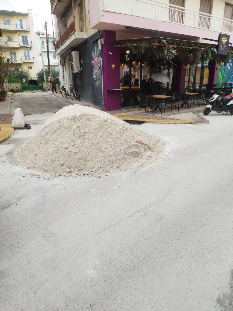 Παρασκευή 20 Φεβρουαρίου 2026. Οι πόλεις σε όλη τη χώρα «φορούν» τα καλά τους για να υποδεχθούν επισκέπτες και να τονώσουν την τοπική οικονομία. Στο Ξυλόκαστρο όμως, η δημοτική αρχή επιλέγει αυτήν ακριβώς τη στιγμή για να επιτρέψει στον εργολάβο να ξεφορτώσει ένα «βουνό άμμο» ακριβώς μπροστά από τα τραπεζάκια και την πόρτα ενός κεντρικού ζαχαροπλαστείου.