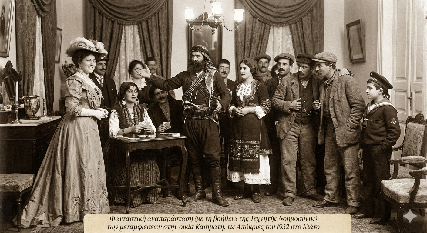 Αντίθετα, το 1932 στο Κιάτο, η Αποκριά έχει μεταλλαχθεί σε ένα κοσμικό γεγονός με έντονα αστικά στοιχεία. Η διασκέδαση έχει μεταφερθεί από το σπίτι στις οργανωμένες αίθουσες, οι μεταμφιέσεις έχουν γίνει πιο θεατρικές και «θεματικές» (απάχηδες, χανούμισσες, μούτσοι), ενώ η παρουσία ορχήστρας και η χρήση όρων όπως «γκρούπ» και «μαστίχα» μαρτυρούν μια κοινωνία που επιζητά τον εκσυγχρονισμό και την κοινωνική επίδειξη.