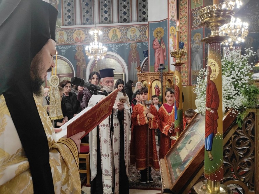 Στον κατάμεστο Ιερό Ναό του Αγίου Δημητρίου τον Σεβασμιώτατο Μητροπολίτη κ.κ. Παύλο καλωσόρισε με θέρμη, εκ μέρους του Εκκλησιαστικού Συμβουλίου και των πιστών, ο Εφημέριος του Ναού Αιδεσ. Πρωτ/ρος π. Παναγιώτης Παπαθανασίου.