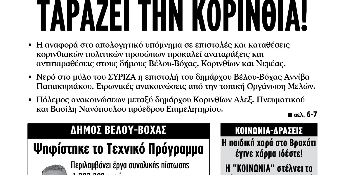 Η απολογία Μπούκουρα όμως δημιούργησε αναταράξεις και στον δήμο Κορινθίων, αφού ο πρόεδρος του Επιμελητηρίου Κορινθίας κ. Νανόπουλος Βασίλης είχε δώσει ένορκη κατάθεση, ενώ οι πρώην δήμαρχοι Σαρωνικού και Σολυγείας, Σωκράτης Τόγιας και Ιωάννης Γκεζερλής αντίστοιχα έστειλαν επιστολές υποστήριξης. Η δημοτική παράταξη του δημάρχου Κορινθίων κ. Αλέξανδρου […]