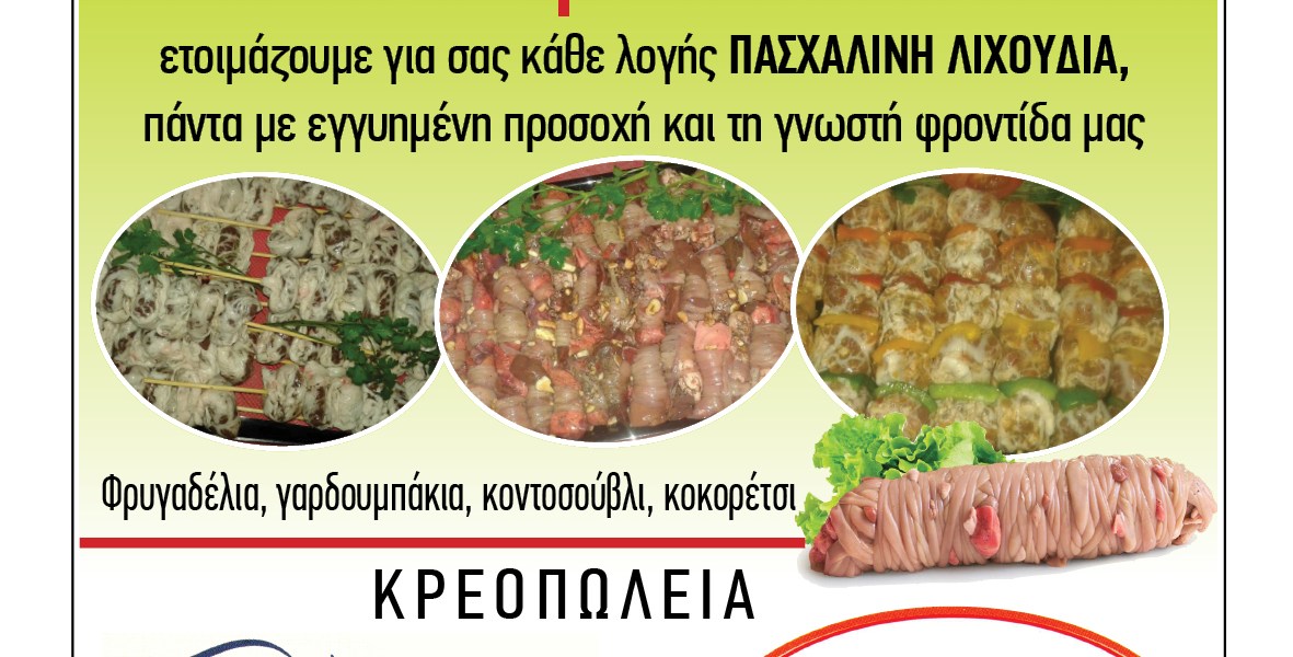 Τα Κρεοπωλεία Μελέτσης στο Ζευγολατιό και Μπεκιάρης στο Βέλο συνεχίζοντας την παράδοση στην εγγυημένη ποιότητα ελληνικών ντόπιων προϊόντων διαθέτουν για το Πάσχα αρνάκια και κατσικάκια σε ασυναγώνιστες τιμές! Επίσης αναλαμβάνουν και ετοιμάζουν για σας κάθε λογής πασχαλινές λιχουδιές (φρυγαδέλια, γαρδουμπάκια, κοκορέτσι, κοντοσούβλι) πάντα με την γνωστή προσοχή και […]