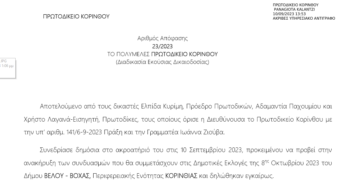 Ανακηρύχθηκαν και δημοσιεύτηκαν πριν λίγη ώρα οι συνδυασμοί στο Πρωτοδικείο Κορίνθου.