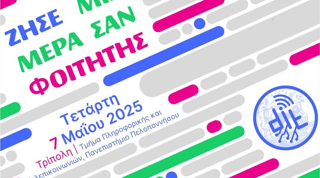 «Ζήσε μια μέρα σαν φοιτητής» στο Τμήμα Πληροφορικής & Τηλεπικοινωνιών του Πανεπιστημίου Πελοποννήσου Την Τετάρτη 7 Μαΐου 2025, το Τμήμα Πληροφορικής και Τηλεπικοινωνιών του Πανεπιστημίου Πελοποννήσου θα ανοίξει τις πόρτες του για να υποδεχθεί στην Τρίπολη μαθητές και μαθήτριες από 12 σχολεία της Περιφέρειας Πελοποννήσου, στο πλαίσιο της […]