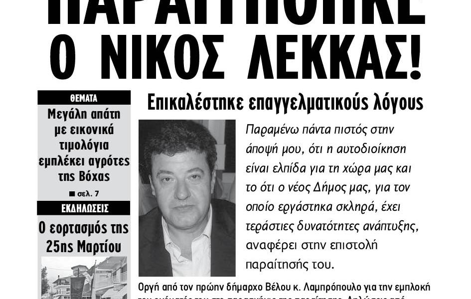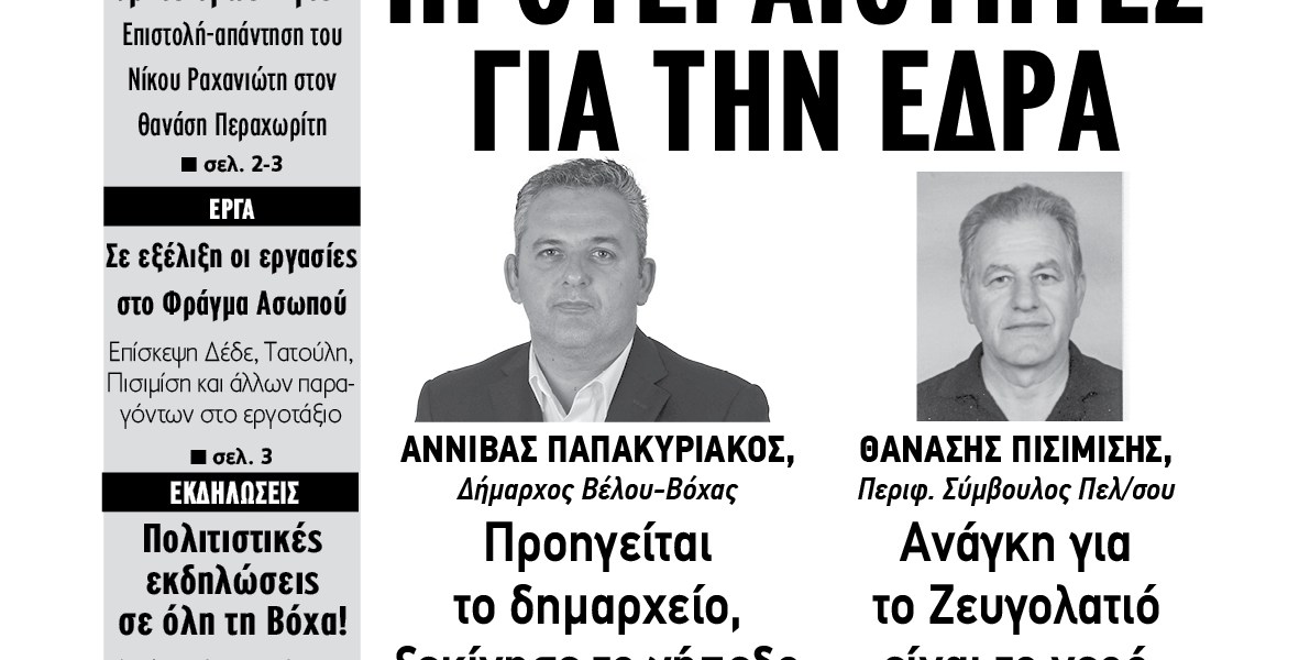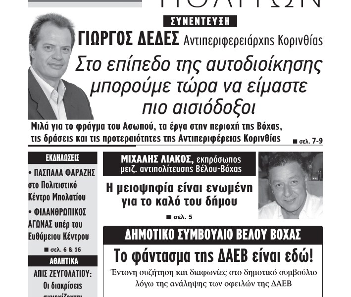 Σ’ αυτό το φύλλο διαβάστε: ΣΥΝΕΝΤΕΥΞΕΙΣ: ΓΙΩΡΓΟΣ ΔΕΔΕΣ, Αντιπεριφερειάρχης Κορινθίας «Στο επίπεδο της αυτοδιοίκησης μπορούμε τώρα να είμαστε πιο αισιόδοξοι» ΜΙΧΑΛΗΣ ΛΙΑΚΟΣ, εκπρόσωπος μειοψηφίας Βέλου-Βόχας: «Η μειοψηφία είναι ενωμένη για το καλό του δήμου» ΤΟ ΦΑΝΤΑΣΜΑ ΤΗΣ ΔΑΕΒ ΕΙΝΑΙ ΕΔΩ! …και κυνηγάει το Δήμο Βέλου-Βόχας σε κάθε Δημοτικό […]