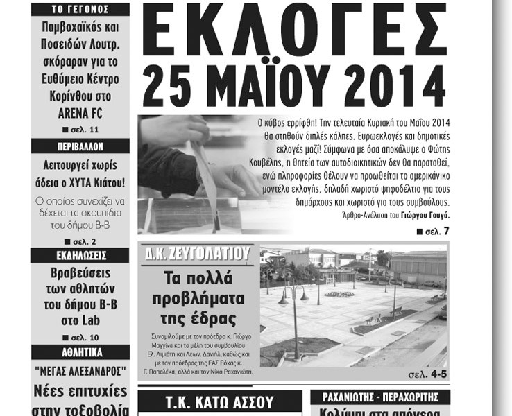 Κυκλοφόρησε το φύλλο 34 της εφημερίδας. Σ’ αυτή την έκδοση διαβάστε: 25 Μαΐου 2014 Δημοτικές Εκλογές! Ο κύβος ερρίφθη! Τα πολλά προβλήματα της έδρας. Αφιέρωμα στο Ζευγολατιό Τ.Κ. Κάτω Άσσου: Βανδαλισμοί και κλοπές στο πρώην αναψυκτήριο Λειτουργεί χωρίς άδεια ο ΧΥΤΑ Κιάτου