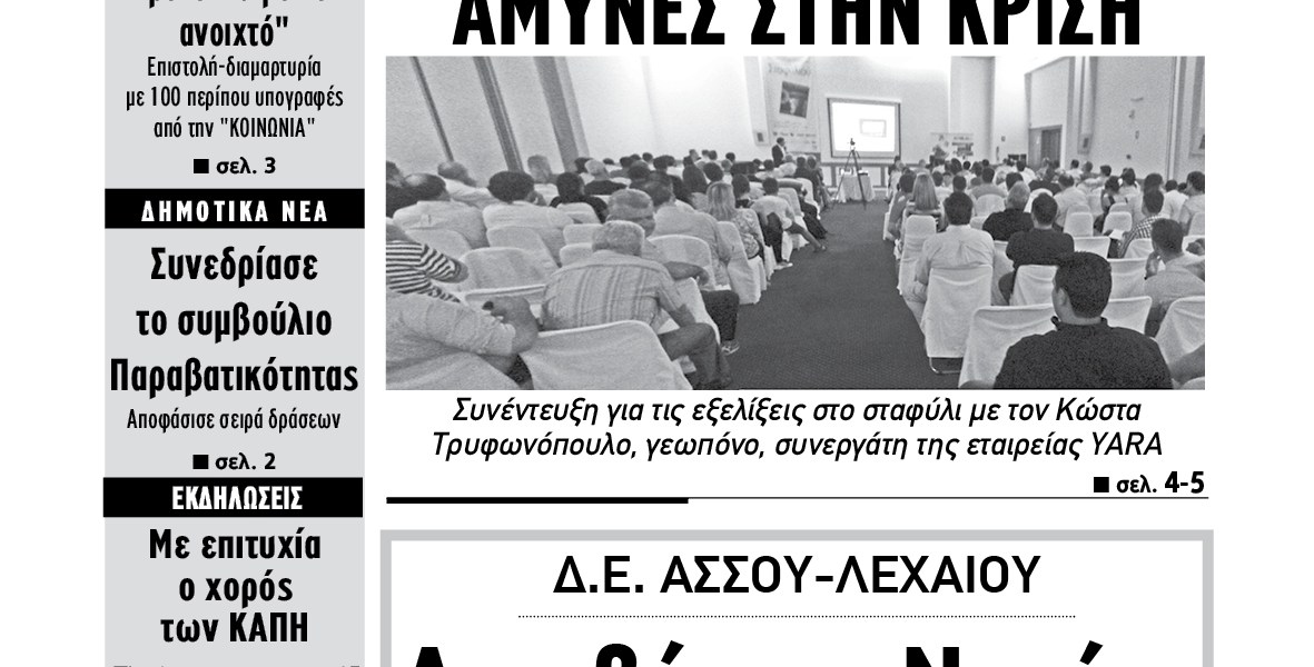 Σ’ αυτό το φύλλο διαβάστε (πατήστε εδώ): Η ΓΕΩΡΓΙΑ ΘΑ ΚΡΑΤΗΣΕΙ ΑΜΥΝΕΣ ΣΤΗΝ ΚΡΙΣΗ Πανελλαδικό Συνέδριο Επιτραπέζιου Σταφυλιού. Συνέντευξη με τον γεωπόνο Κ. Τρυφωνόπουλο ΑΚΡΙΒΟ ΜΟΥ ΝΕΡΑΚΙ Διαμαρτυρίες στην περιοχή Άσσου-Λεχαίου για τις τιμές του νερού ΤΟ ΤΑΧΥΔΡΟΜΕΙΟ ΔΕΝ ΠΡΕΠΕΙ ΝΑ ΚΛΕΙΣΕΙ Παρέμβαση με συλλογή υπογραφών του […]