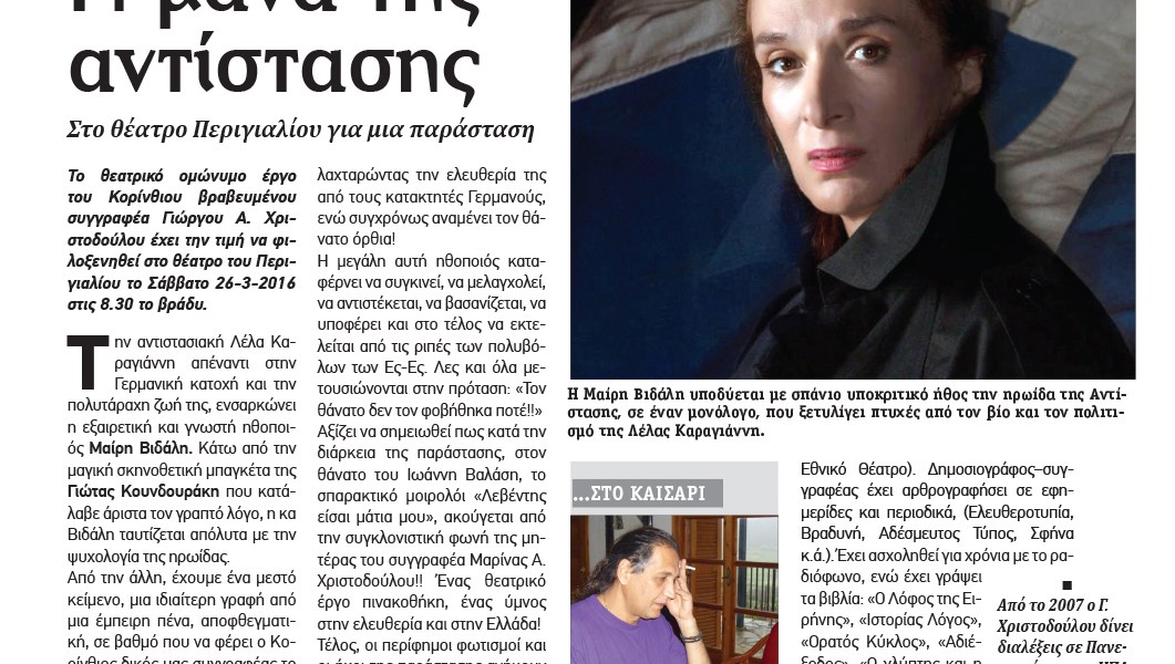 «ΛΕΛΑ ΚΑΡΑΓΙΑΝΝΗ: Η μάνα της αντίστασης» στο θέατρο Περιγιαλίου στις 26 Μαρτίου
