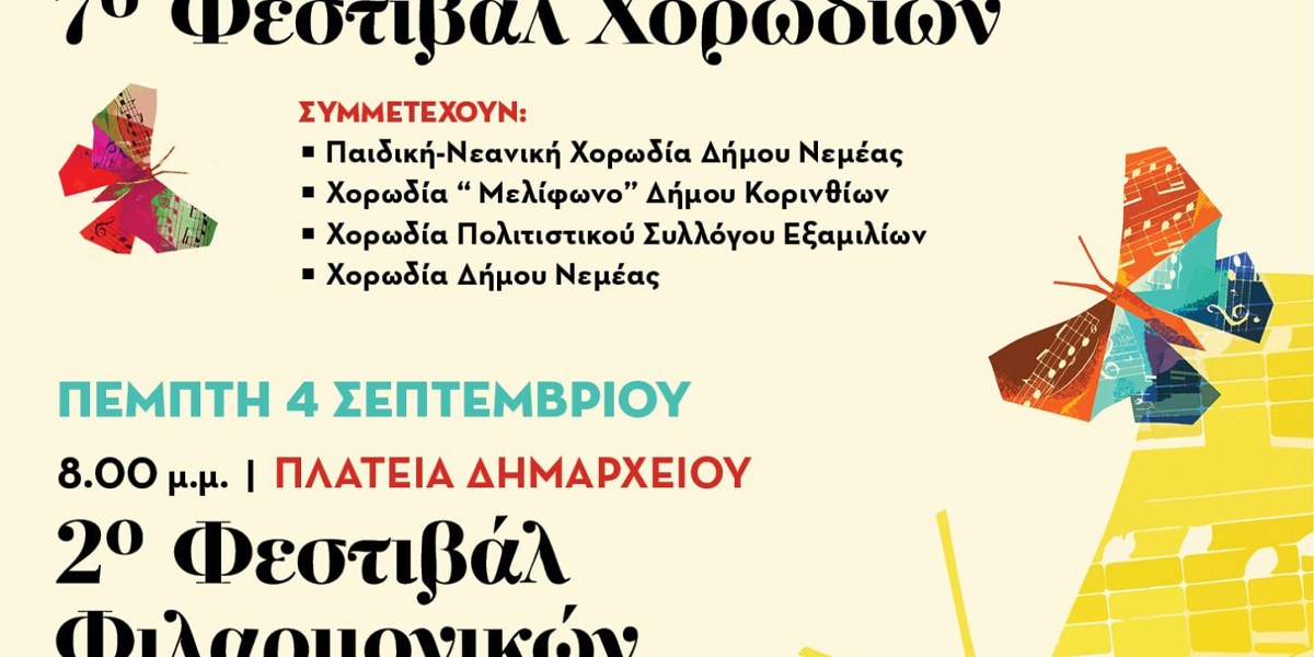 Η κεντρική πλατεία της Νεμέας πλημμύρισε από φωνές, μουσικές και χειροκροτήματα στις 3 και 4 Σεπτεμβρίου, καθώς το πολιτιστικό καλοκαίρι 2025 κορυφώθηκε με δύο σπουδαίες διοργανώσεις: το 7ο Φεστιβάλ Χορωδιών και το 2ο Φεστιβάλ Φιλαρμονικών του Δήμου Νεμέας.